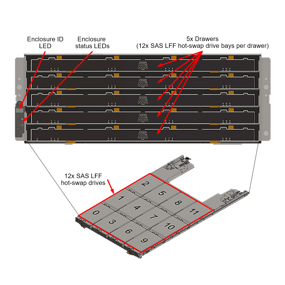 | Hot-swap parts | Controllers, I/O modules, drives, power supplies, cooling modules (4U60 LFF only), and SFP+/SFP28 transceivers. |